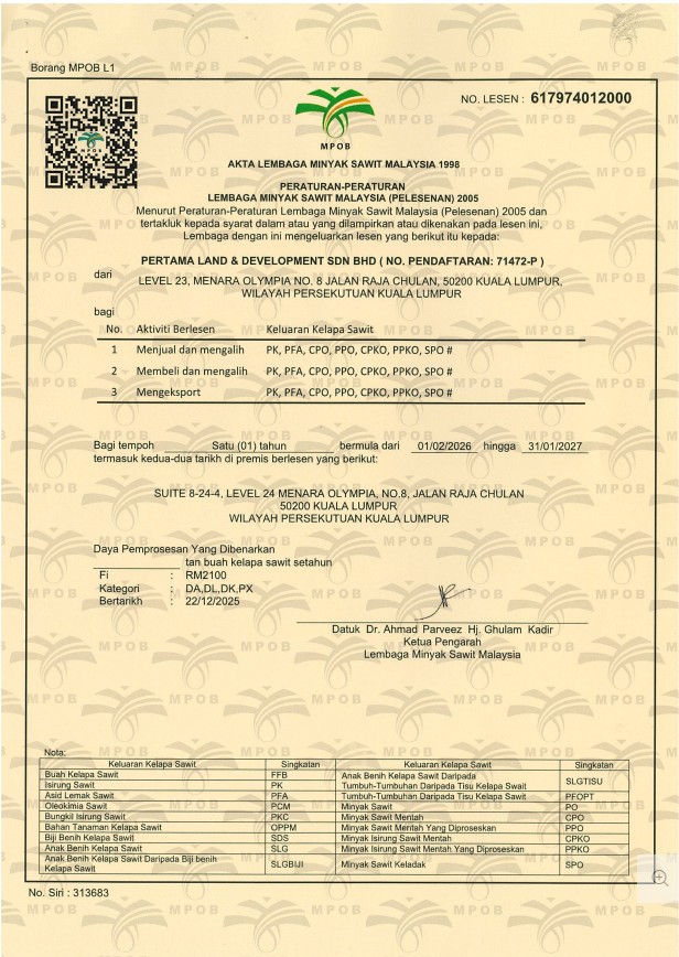 Pertama Land & Development Sdn Bhd (PLD) is a wholly-owned subsidiary of Duta Land Berhad with businesses in the property and palm oil industries. PLD has extensive experience in palm oil plantation cultivation and management. PLD sees the future in specialty oils and fats; and the need for safe, sustainable and functional foods in the edible oils industry.